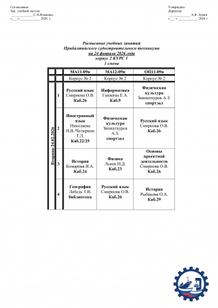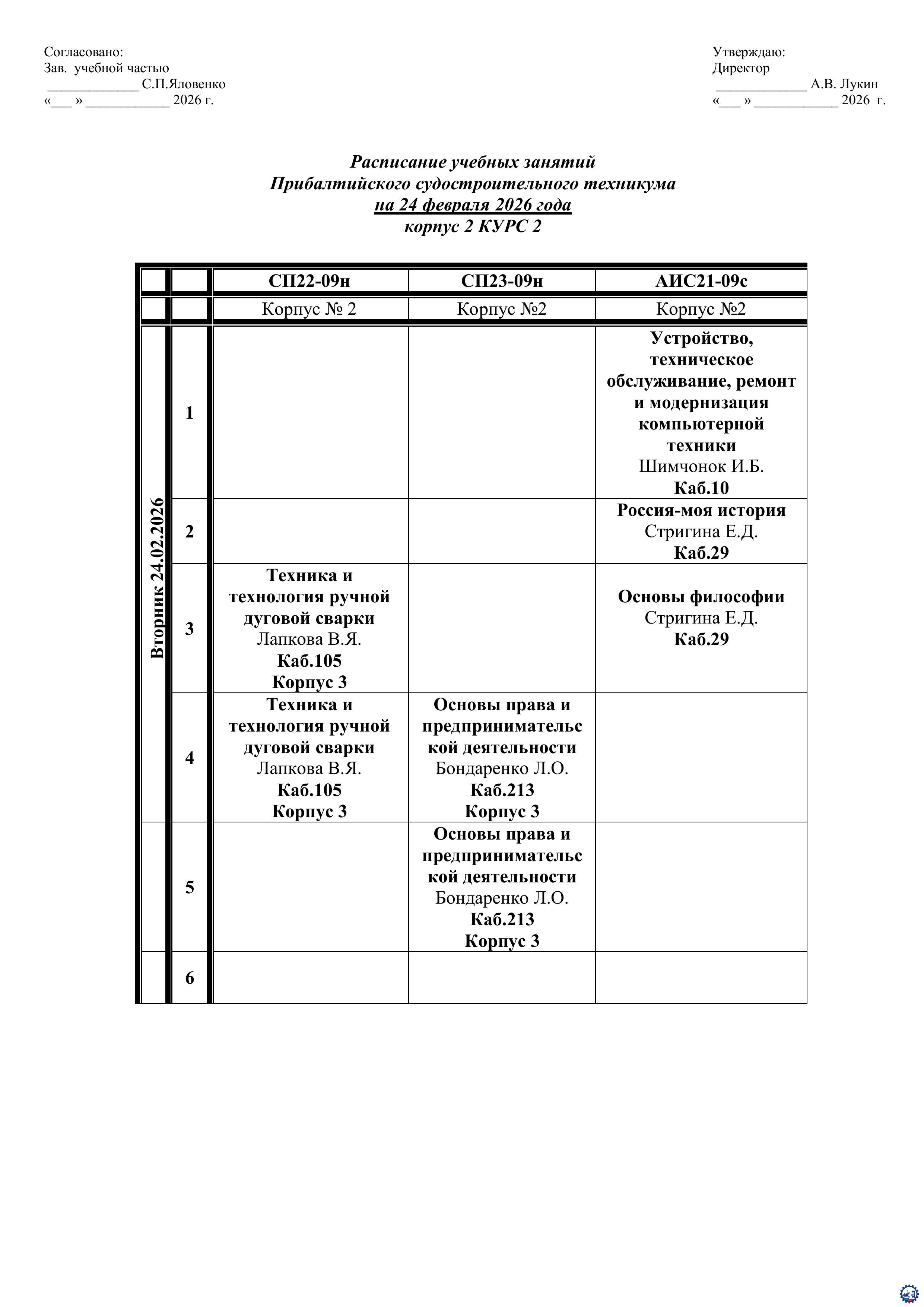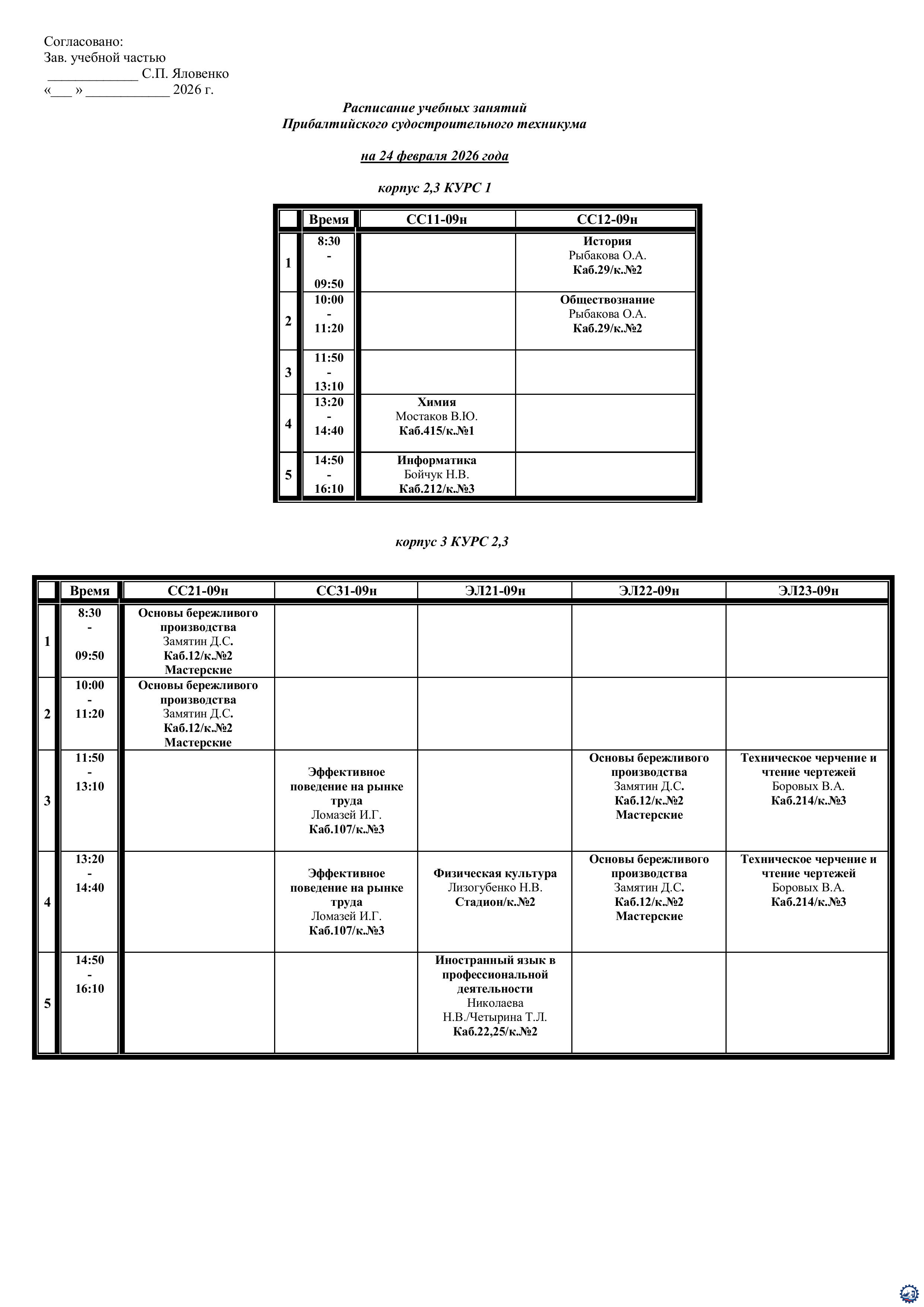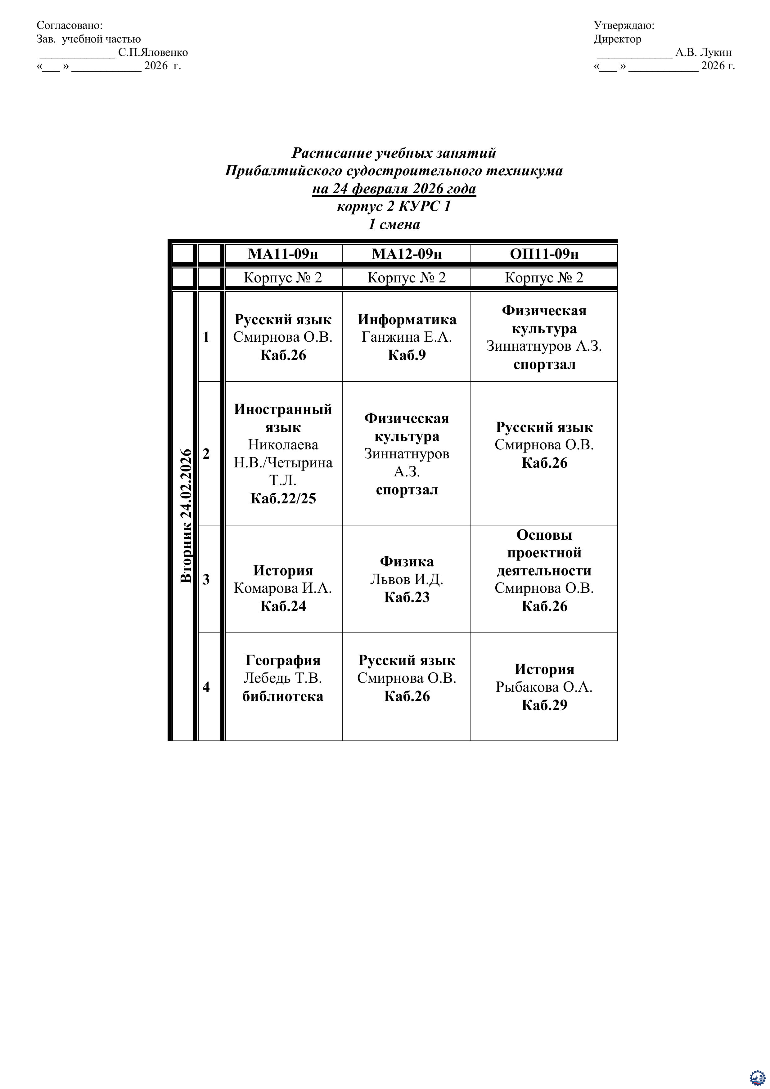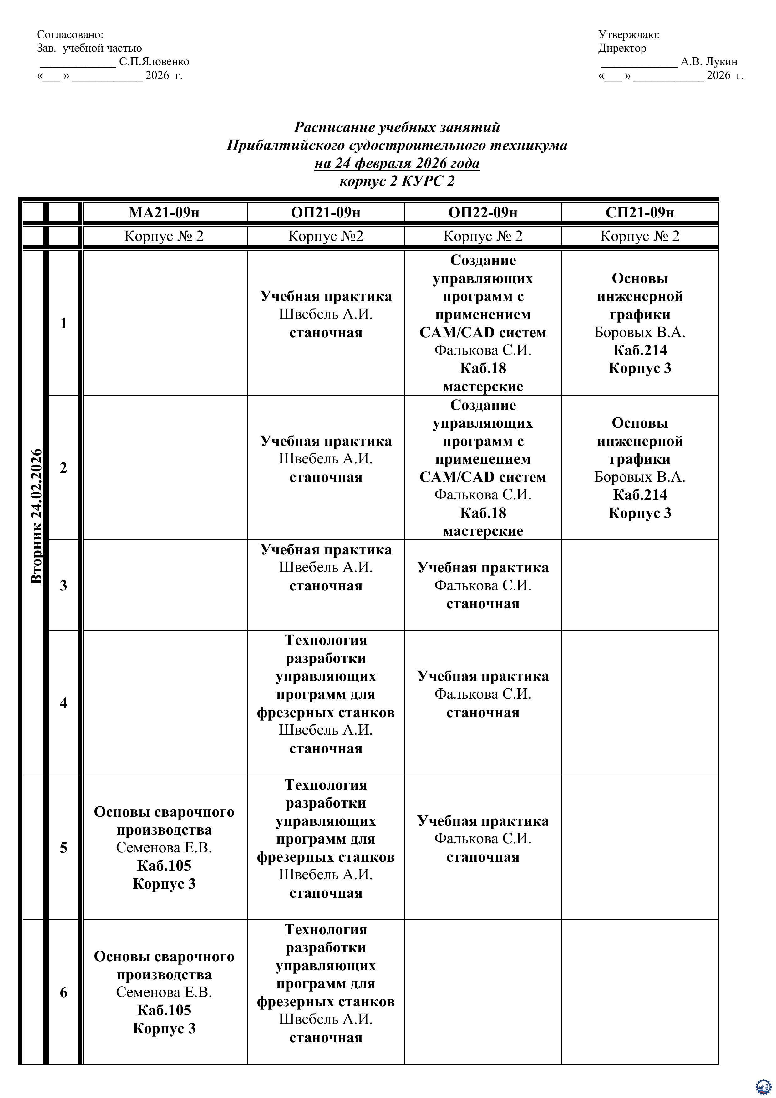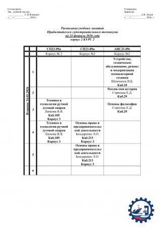 📆 Расписание занятий на 24.02.26 Опубликовал: Manager, 20-02-2026, 19:12, Расписание занятий / Расписание занятий (очка), 693, 0 0 1 2 3 4 5