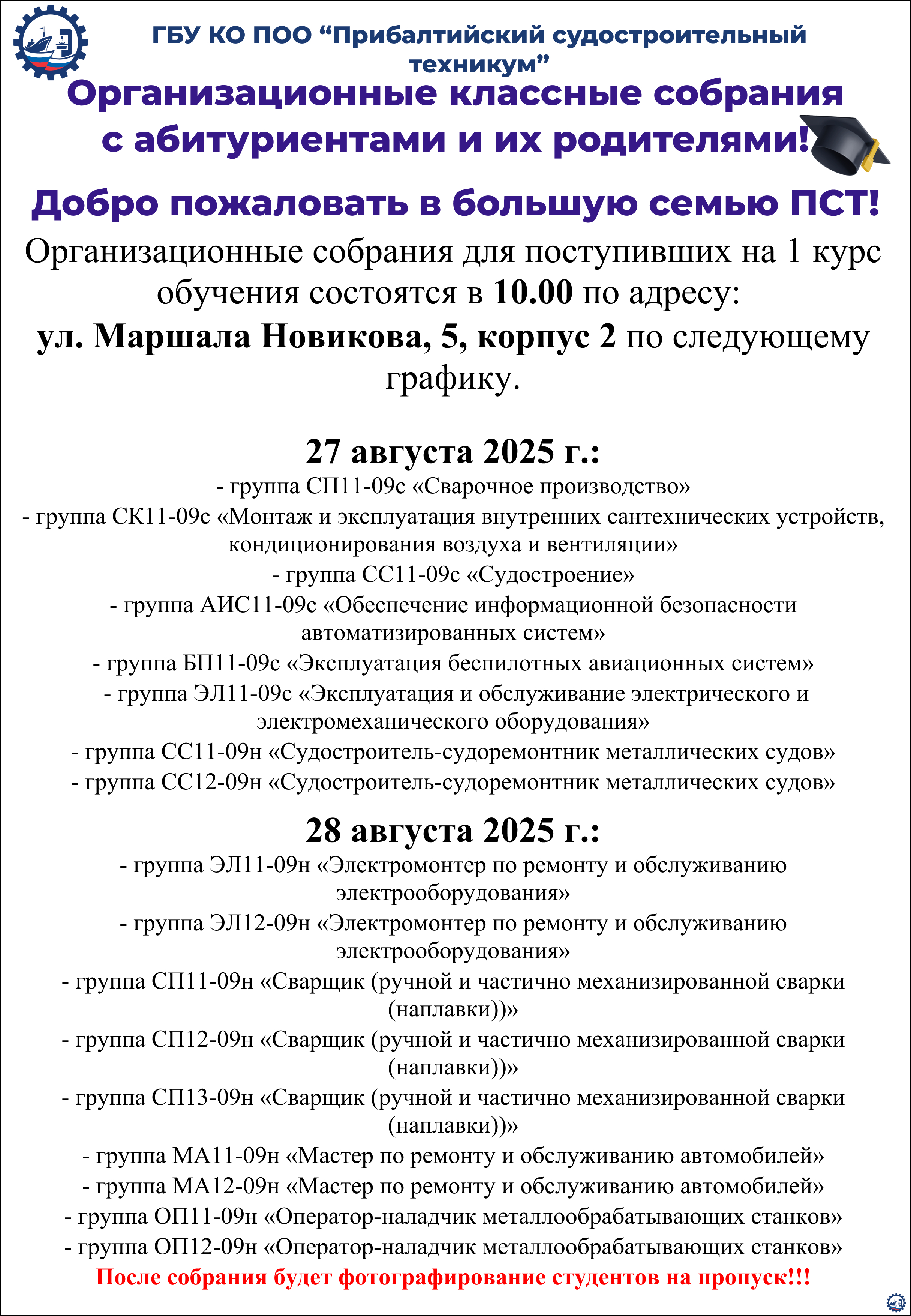 Организационные собрания для поступивших на 1 курс обучения состоятся в 10.00 по адресу: ул. Маршала Новикова, 5, корпус 2 по следующему графику.