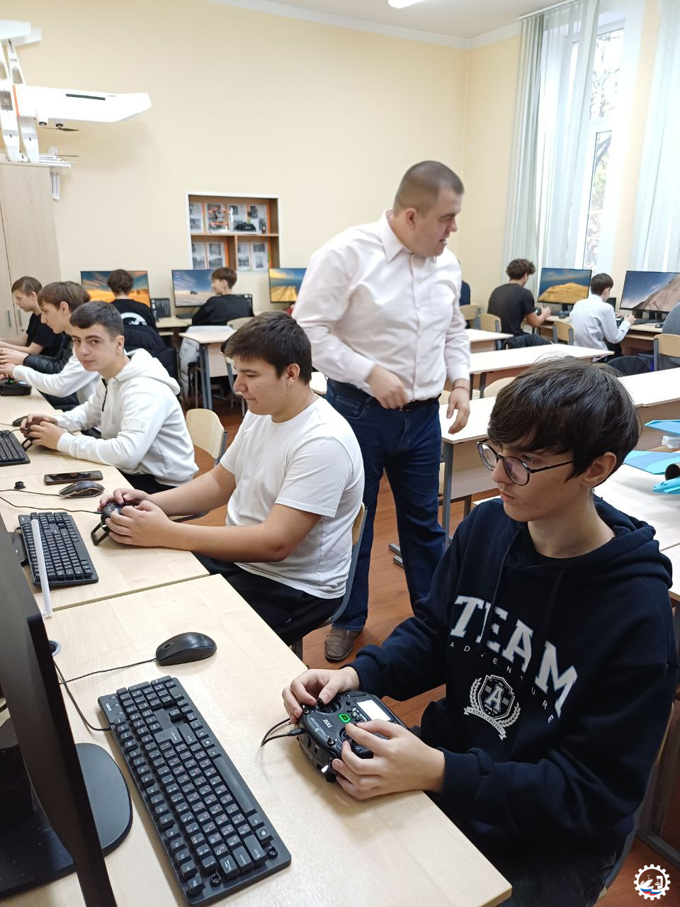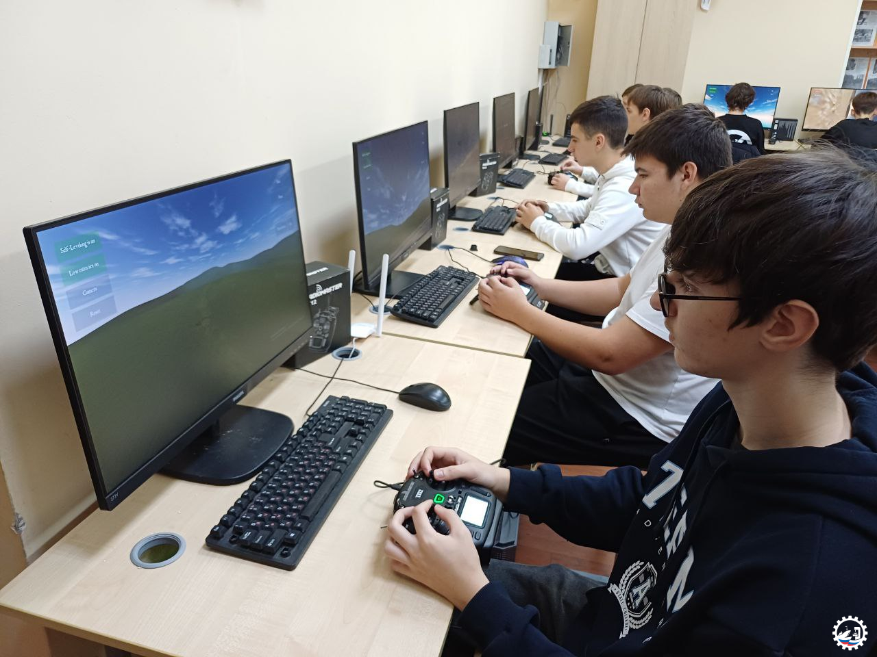 🚁 На симуляторах участники поднимали беспилотные летательные аппараты в небо и выполняли посадку.