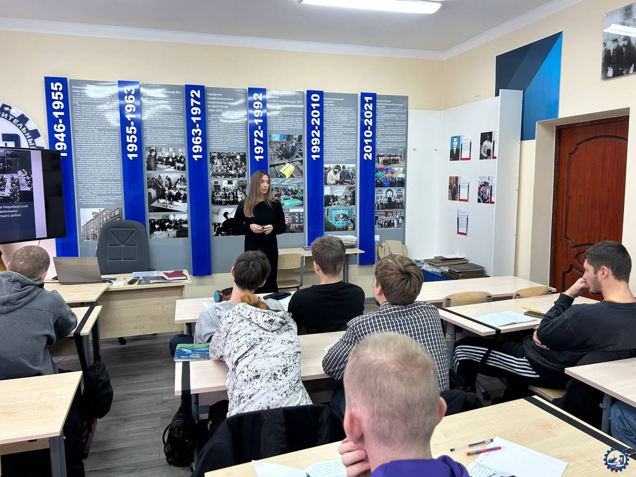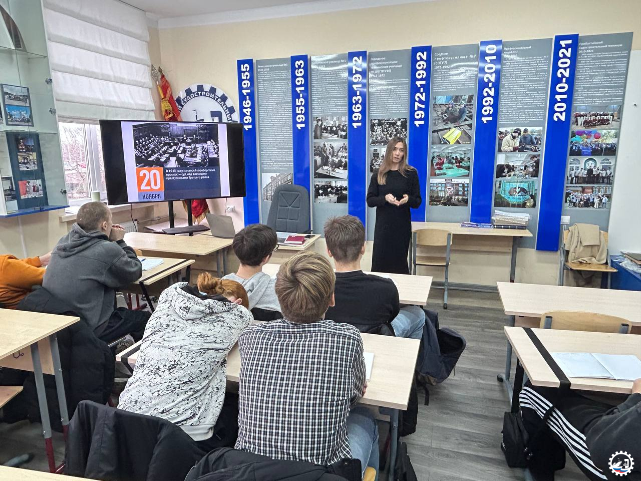 Вниманию студентов был представлен видеоурок «День начала Нюрнбергского процесса», показаны кадры кинохроники Нюрнбергского процесса и рассказано о «Суде истории», на котором были вынесены обвинения главным нацистским преступникам, участвовавшим в преступлениях против мира, человечности и в военных преступлениях.