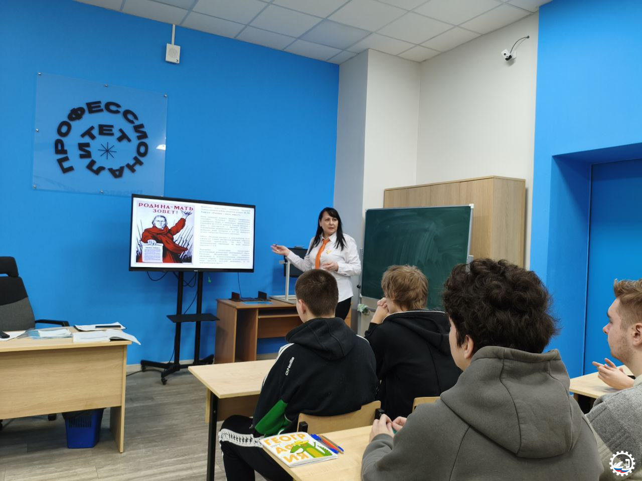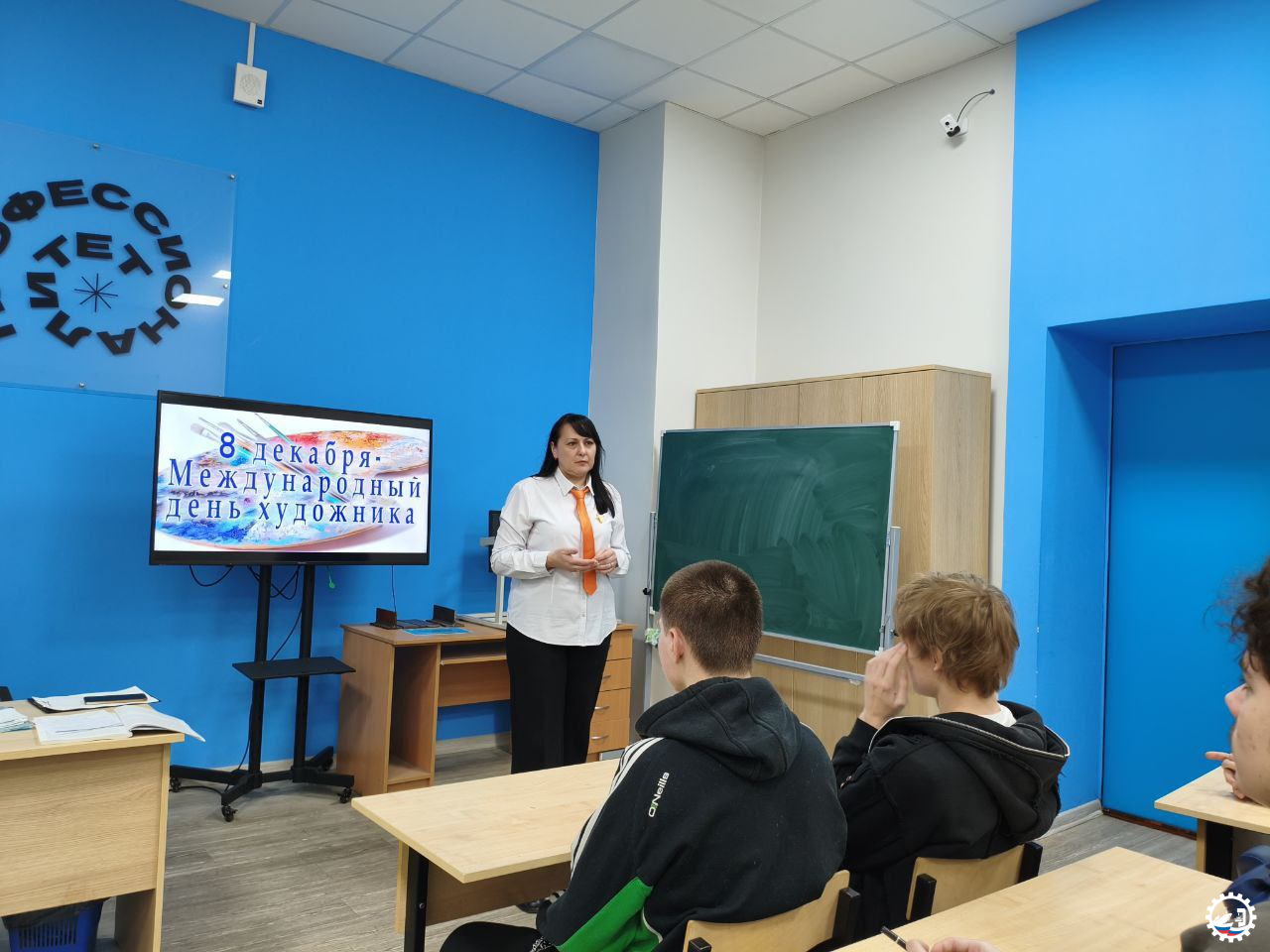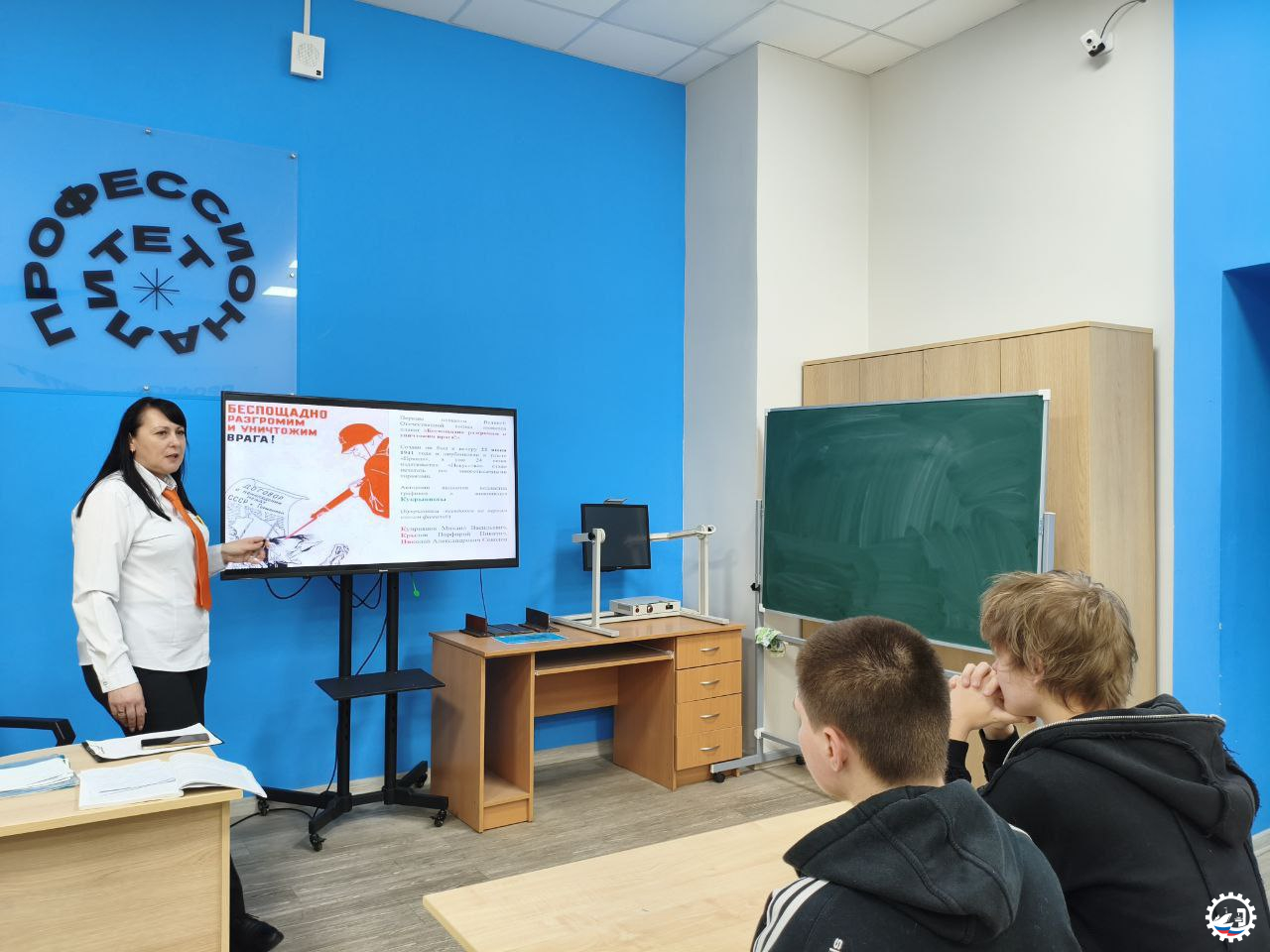 Советник директора провела занятие со студентами на тему «Художники во время Великой Отечественной войны», где рассказала о особых, героических страницах в истории искусства. В условиях невиданных испытаний, разрушений и потерь, творцы не сложили оружие. Они стали солдатами, репортерами, плакатистами, агитаторами. Их кисти и карандаши превратились в мощное оружие, способное вдохновлять, поддерживать боевой дух, обличать врага и увековечивать подвиги.