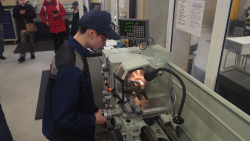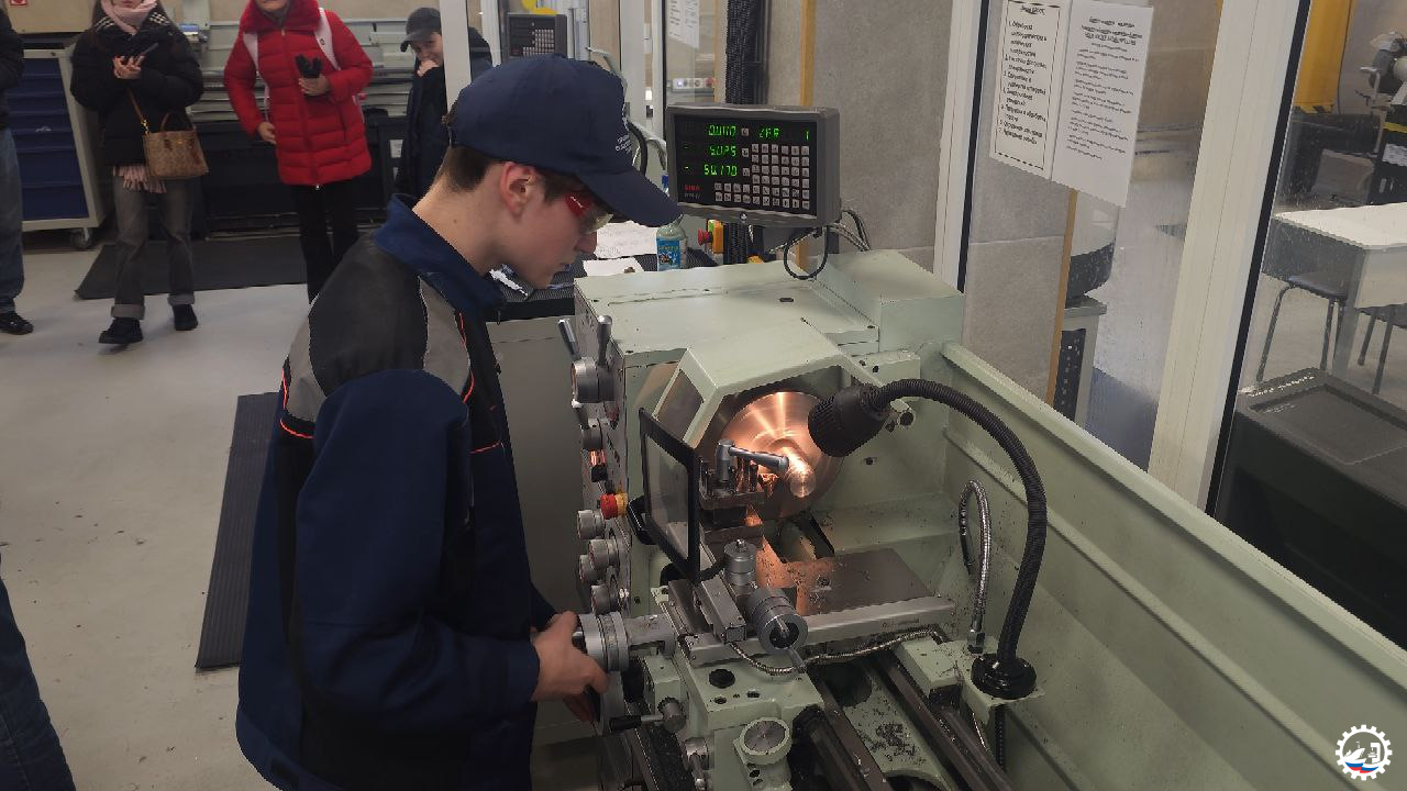 Не менее увлекательным стало знакомство с токарно‑винторезным станком: школьники увидели, как из заготовки формируется деталь — как вращается металл и резец аккуратно снимает слой за слоем. Важным моментом экскурсии стало сравнение двух подходов к обработке: традиционного токарного станка с ручным управлением, где всё зависит от мастерства оператора, и современного станка с числовым программным управлением, который работает по заданной программе с высокой точностью и повторяемостью. Ребята поняли, что оба метода по‑своему важны: ручные станки незаменимы для единичных изделий и ремонта, а ЧПУ — для серийного производства сложных деталей.