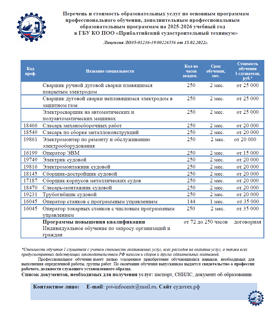 Для желающих повысить свою квалификацию, или получить новую профессию Прибалтийский судостроительный техникум предлагает большой выбор краткосрочных курсов для разных возрастных категорий граждан.