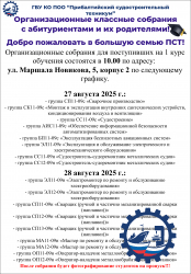 Внимание! Уважаемые абитуриенты! Организационные собрания для поступивших на 1 курс обучения состоятся в 10.00 по адресу: ул. Маршала Новикова, 5, корпус 2 по следующему графику. 27 августа 2025 г.: - группа СП11-09с «Сварочное производство» - группа СК11-09с «Монтаж и эксплуатация внутренних